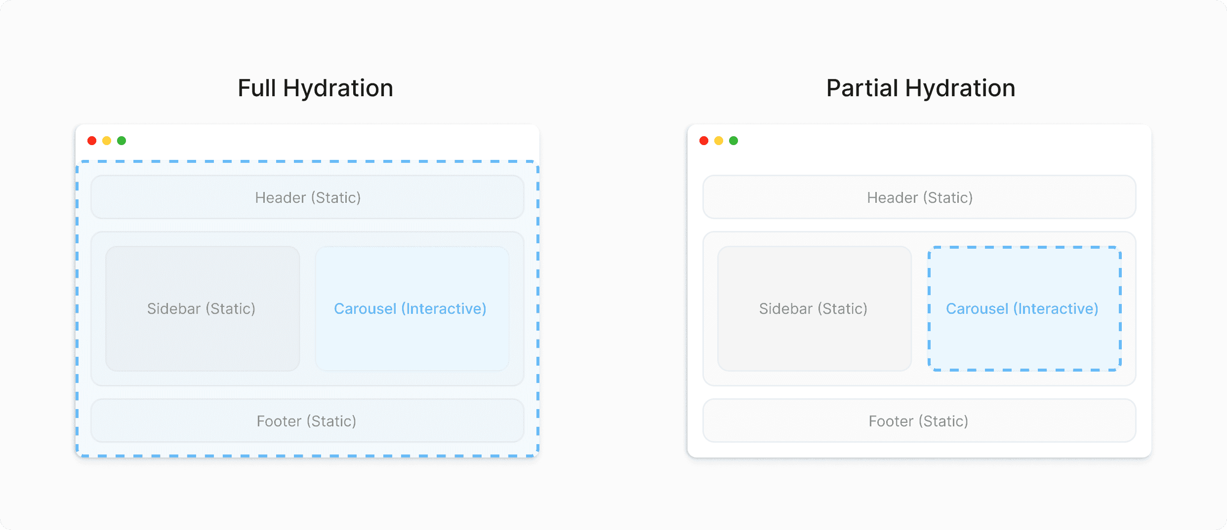 Partial Hydration enables you to selectively add interactivity to your otherwise completely static app. This results in improved frontend performance while keeping the benefits of client-side apps. Gatsby uses React server components to achieve this.