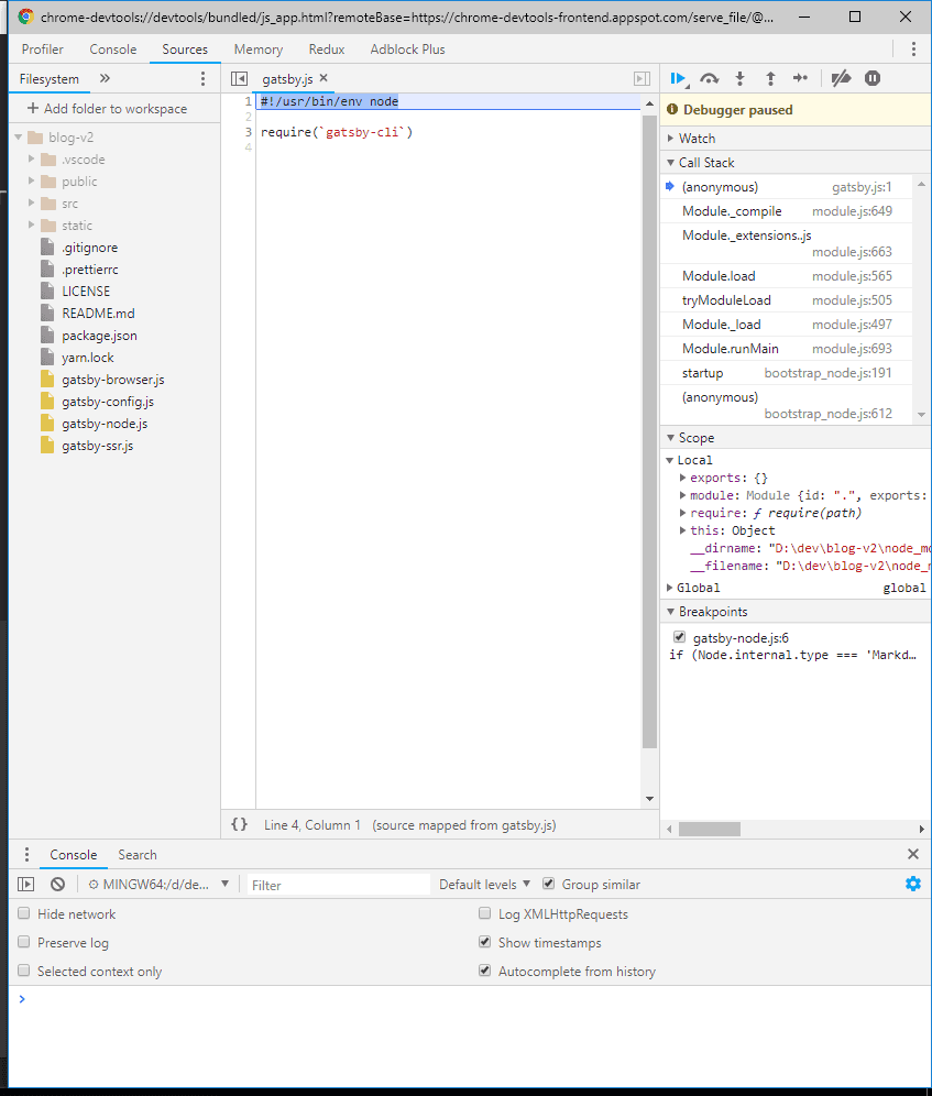 node --nolazy node_modules/.bin/gatsby develop --inspect-brkinstead ofgatsby developornode --nolazy --inspect-brk node_modules/.bin/gatsby buildinstead ofgatsby buildSet breakpoints and debug!