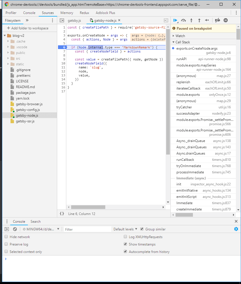 Now you can resume code execution by clicking the “resume” icon in the DevTools debug toolbar (or press F8 on your keyboard). Gatsby will start running and pause once it reaches a breakpoint, allowing you to inspect variables: