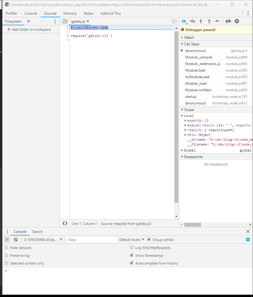 You should see Chrome DevTools start and that code execution is paused at the start of the gatsby.js entry file: