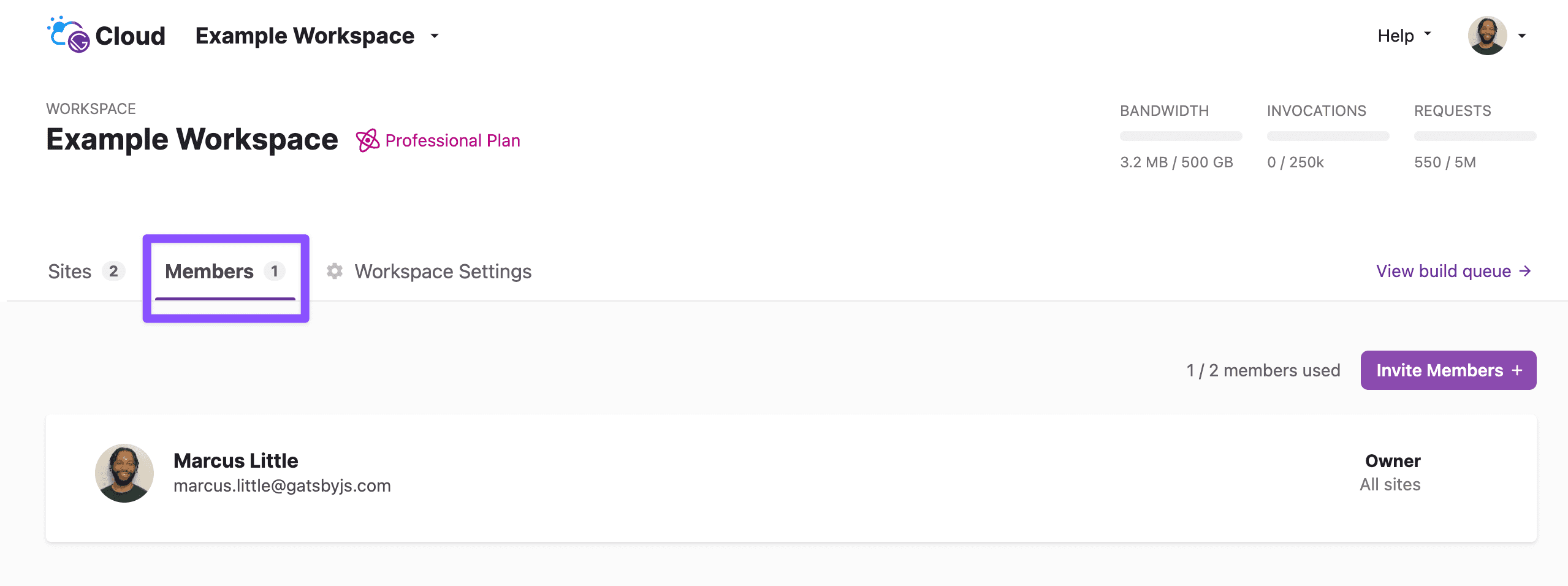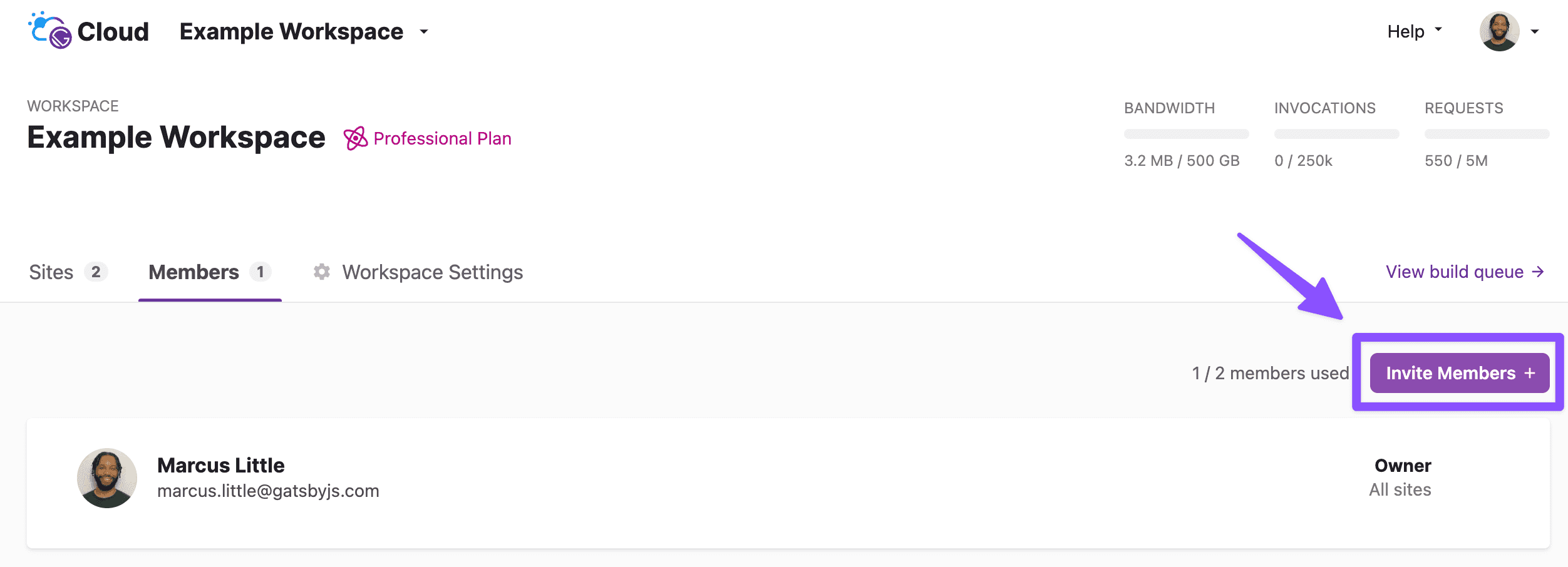 - “Owner” - The person who created the Workspace on Gatsby Cloud is the Owner. An Owner can edit the Workspace, manage billing, and invite/manage Members.