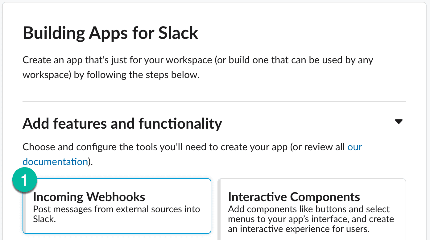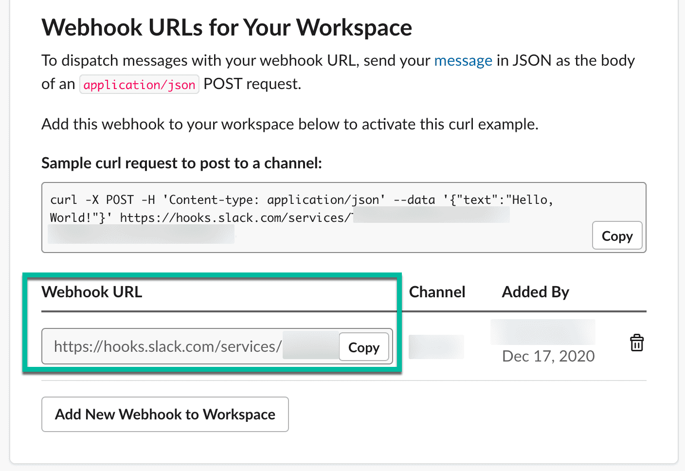 - Next, add the “Incoming Webhook” feature and activate it. Then, at the bottom of that page, click “Add New Webhook to Workspace”: