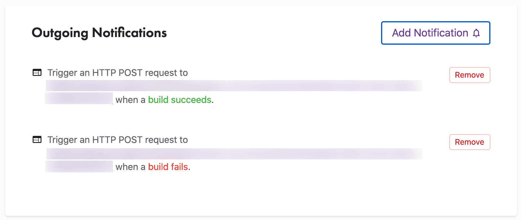 - Next, you will be prompted to add a webhook that will receive the payload of information about your build or deploy. There are the following options for event notifications: