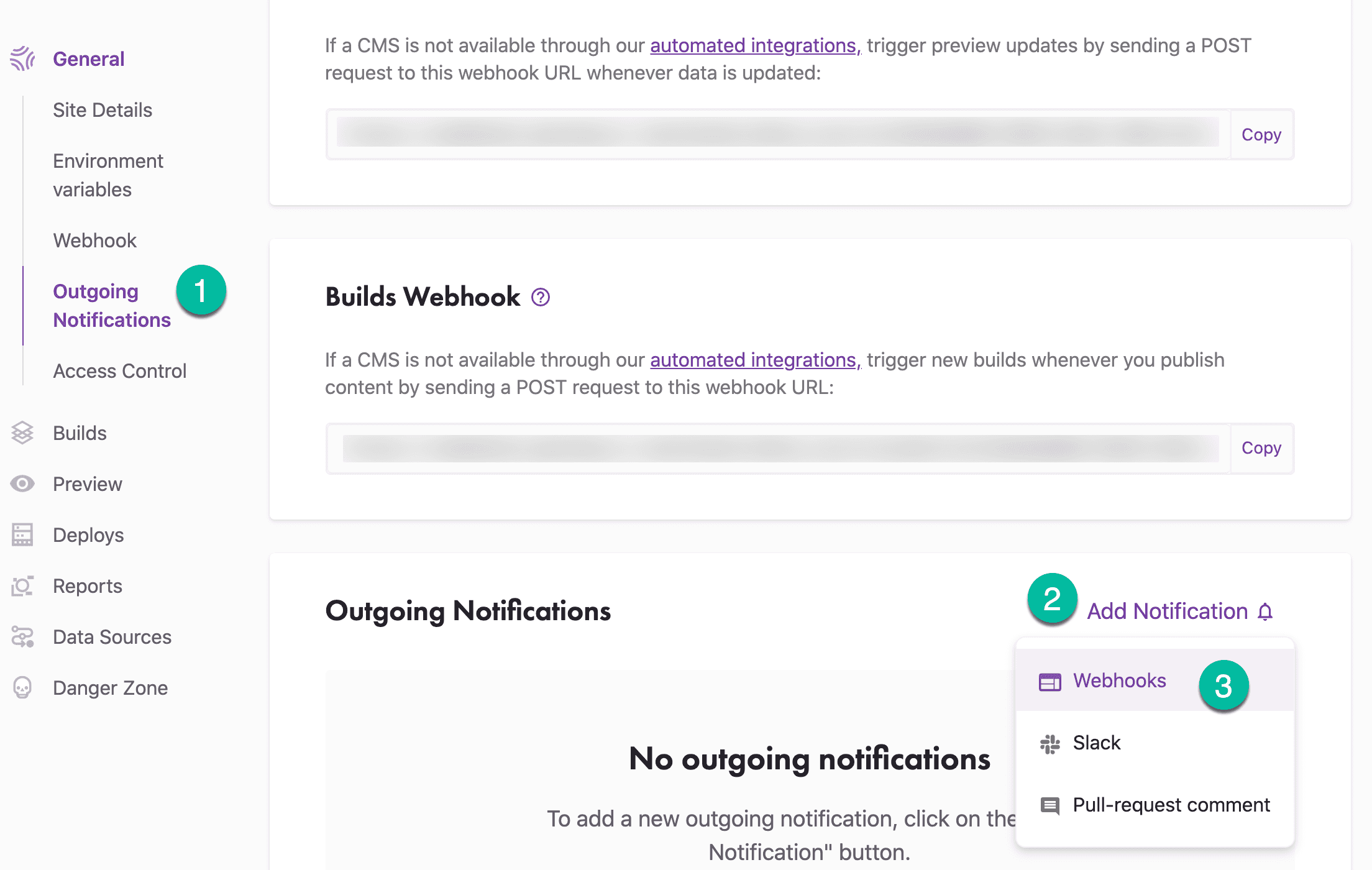 - First, navigate to “Site Settings”. In the sidebar menu under “General”, select “Outgoing Notifications”. Then click “Add Notification” and choose the “Webhooks” option.
