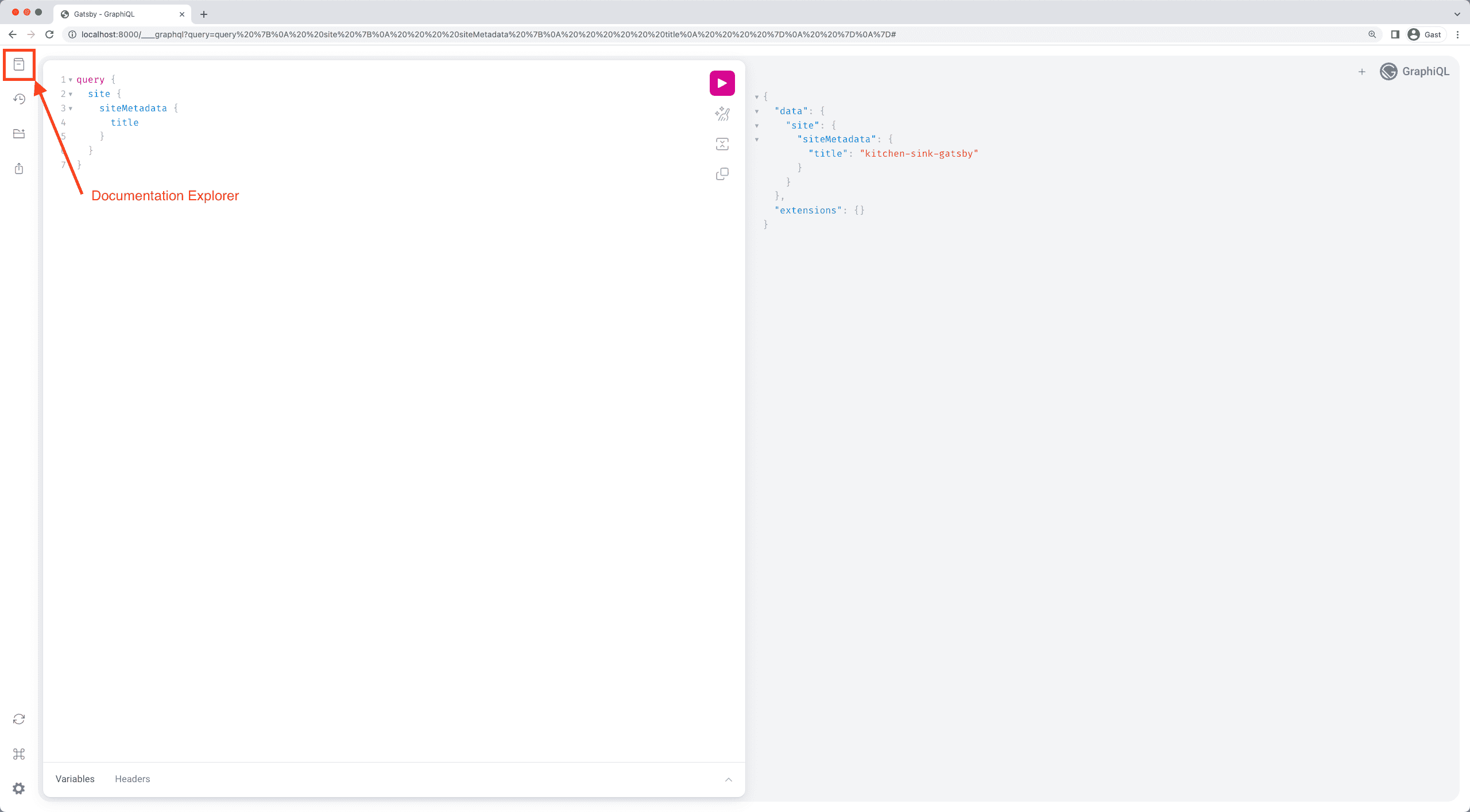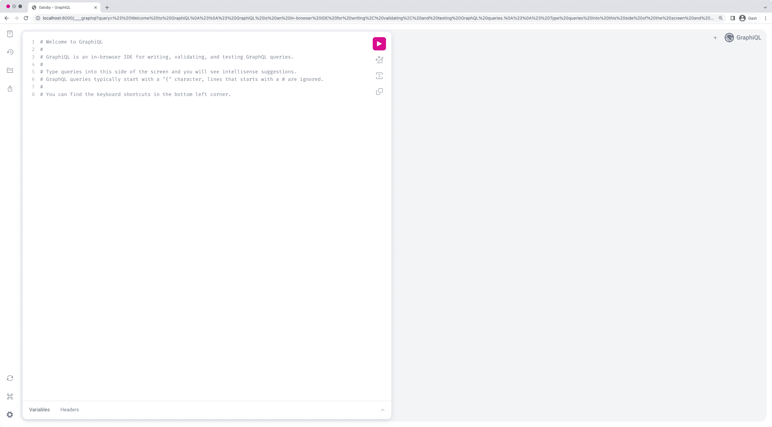 When the development server is running for one of your Gatsby sites, open GraphiQL at http://localhost:8000/___graphql to see the interface: