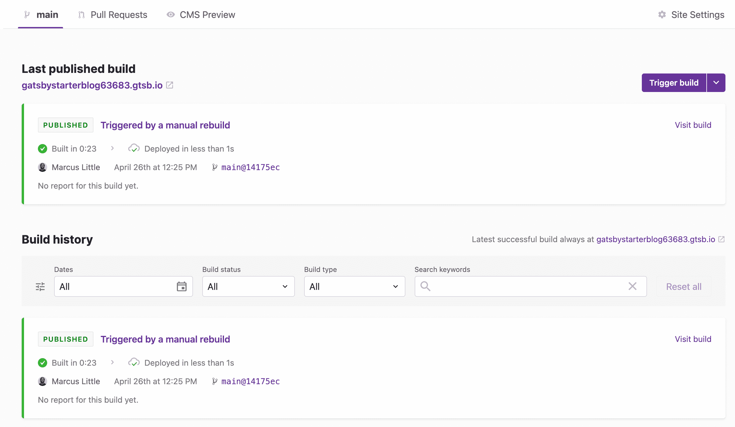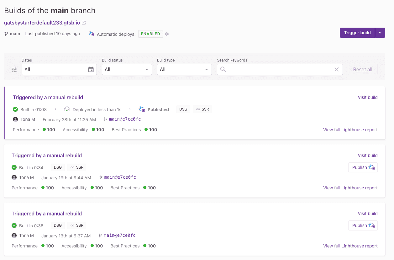 - the Trigger Build button in the Gatsby Cloud user interface is clicked
