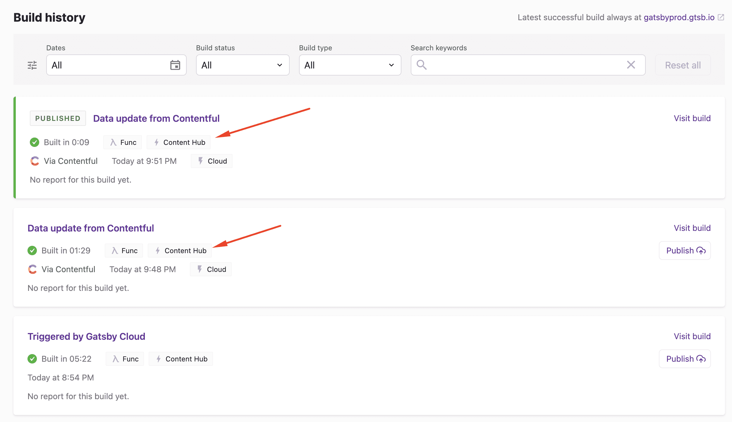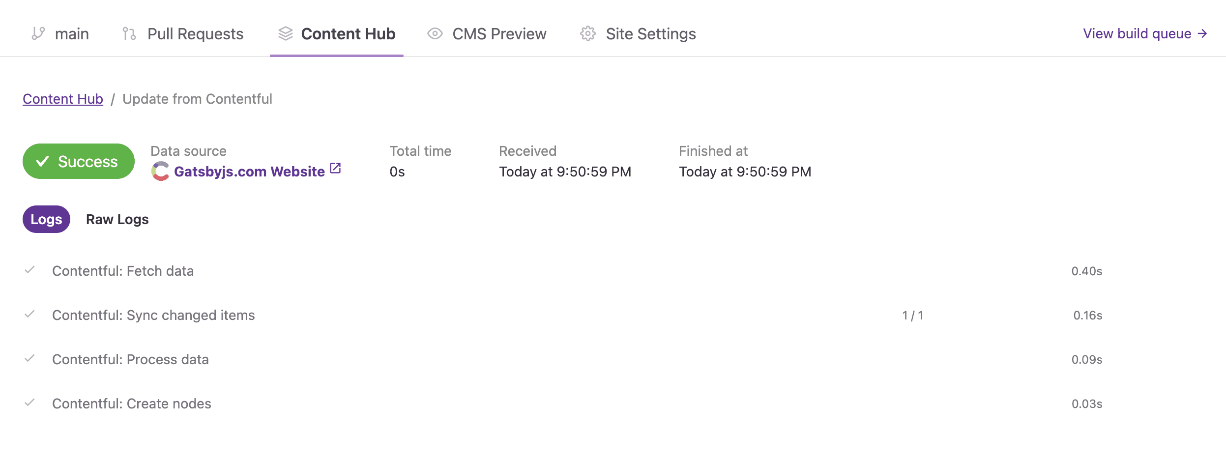 Not every build can use Content Hub. If you are changing your source plugin configuration options, for example, your sourced content might need to change. In this case, your Gatsby build will fall back on sourcing content from your CMS API the same way it does today. If those changes are merged that sourced content will be cached in Content Hub and used in subsequent builds.