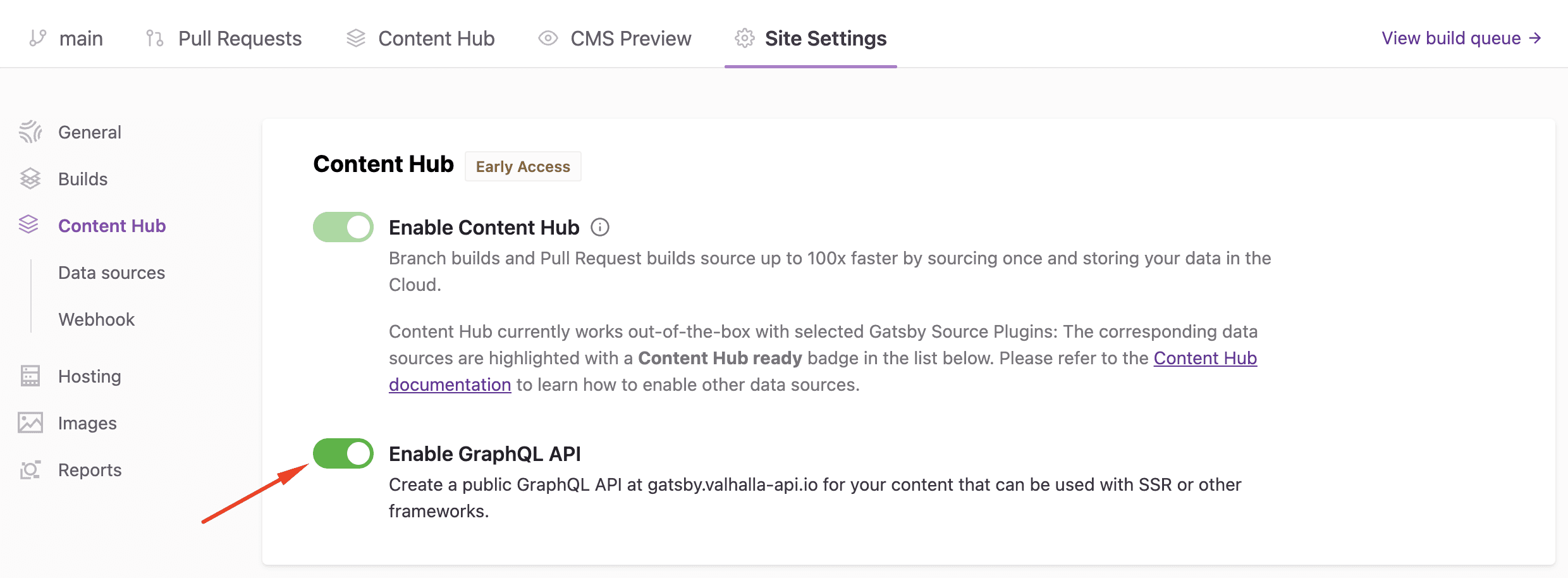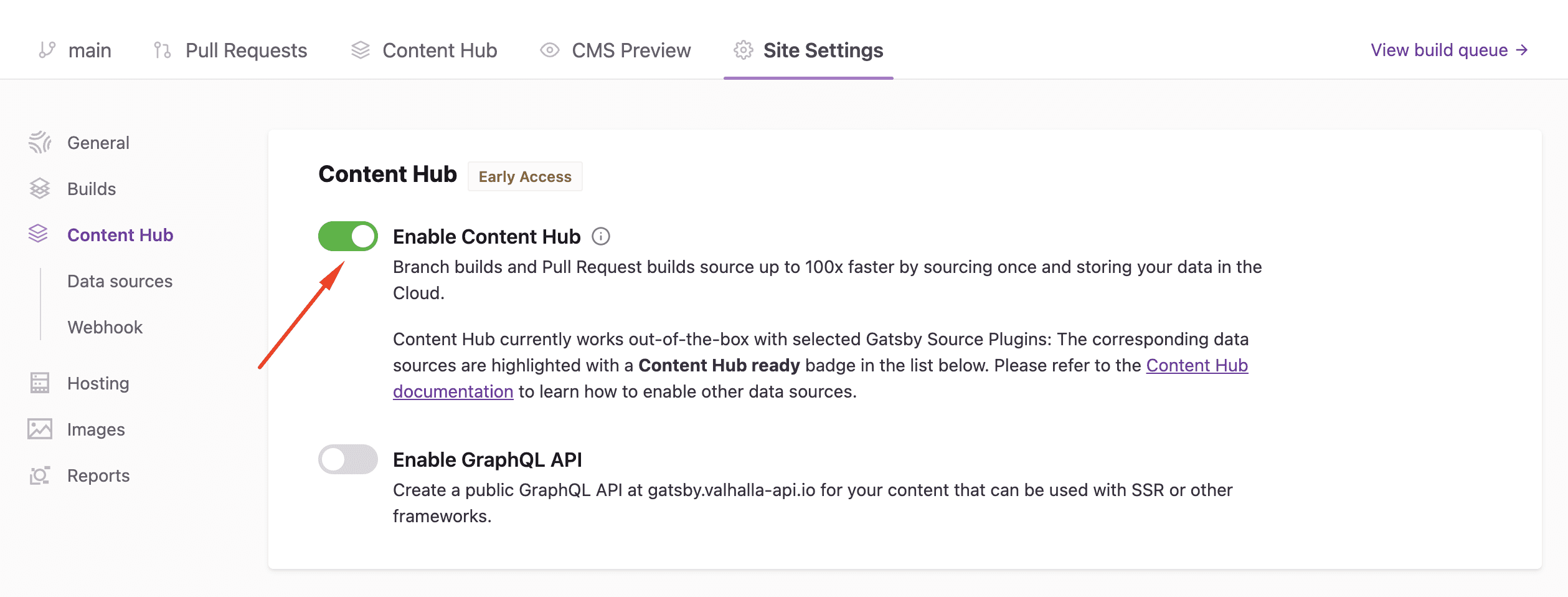 This guide will show you how to enable and use Valhalla Content Hub with a Gatsby site on Gatsby Cloud. Valhalla Content Hub caches your Gatsby site’s data layer. This speeds up the sourcing process of your builds for large content sites. With Valhalla Content Hub, you can also enable a GraphQL API that will allow you to access your Gatsby data outside of the build process.