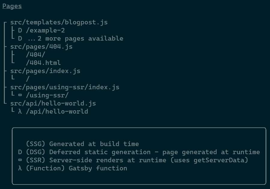 With our new rendering options you now can have different kinds of pages in your project. We’ve added an output for gatsby build that tells you exactly which pages are SSG, DSG, SSR, or a Gatsby Function.