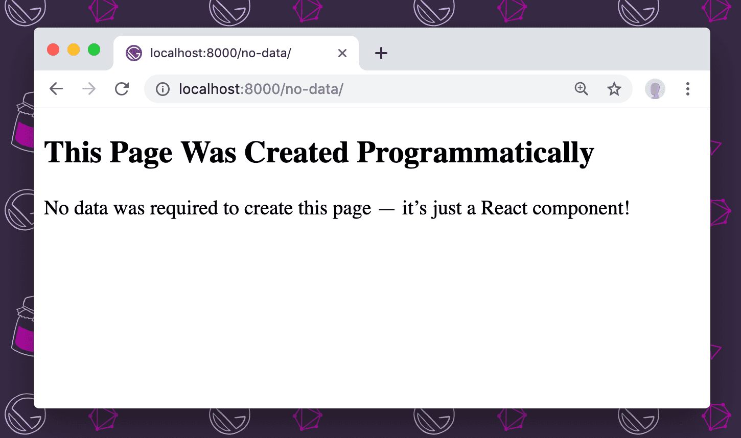 After running gatsby develop, you’ll see the following at http://localhost:8000/no-data/: