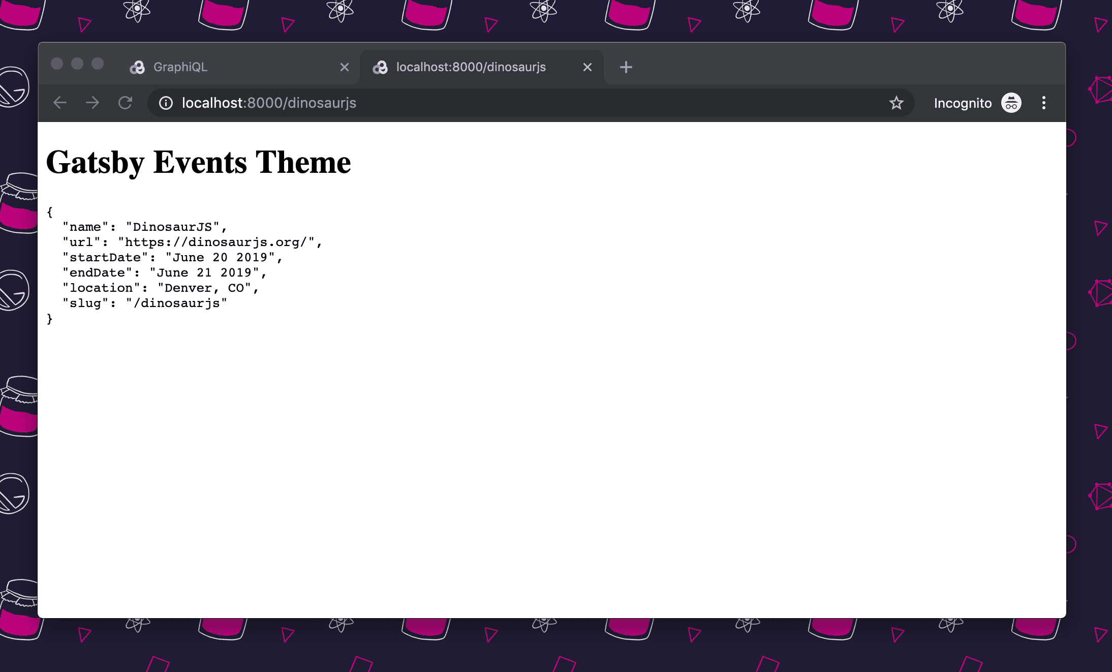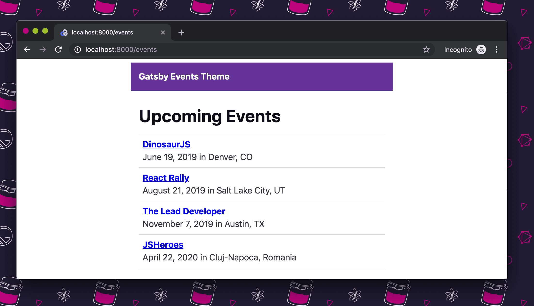 @jlengstorf/gatsby-theme-events, use the theme you just published instead! Or if you didn’t want to actually publish your test theme, go ahead and use@jlengstorf/gatsby-theme-events.