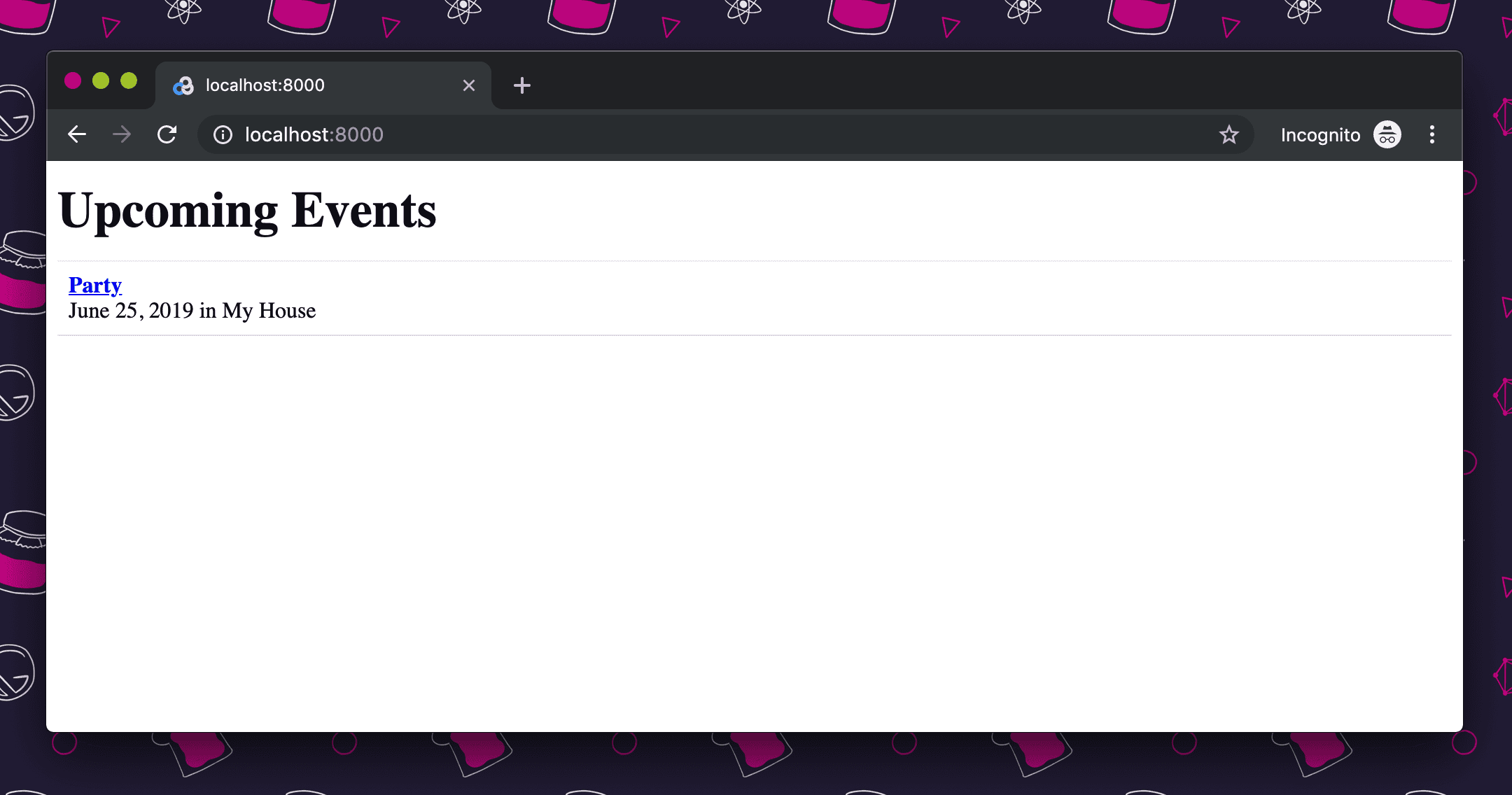 The events listing page will now be accessible at http://localhost:8000/events. Hitting http://localhost:8000/ will return a 404.