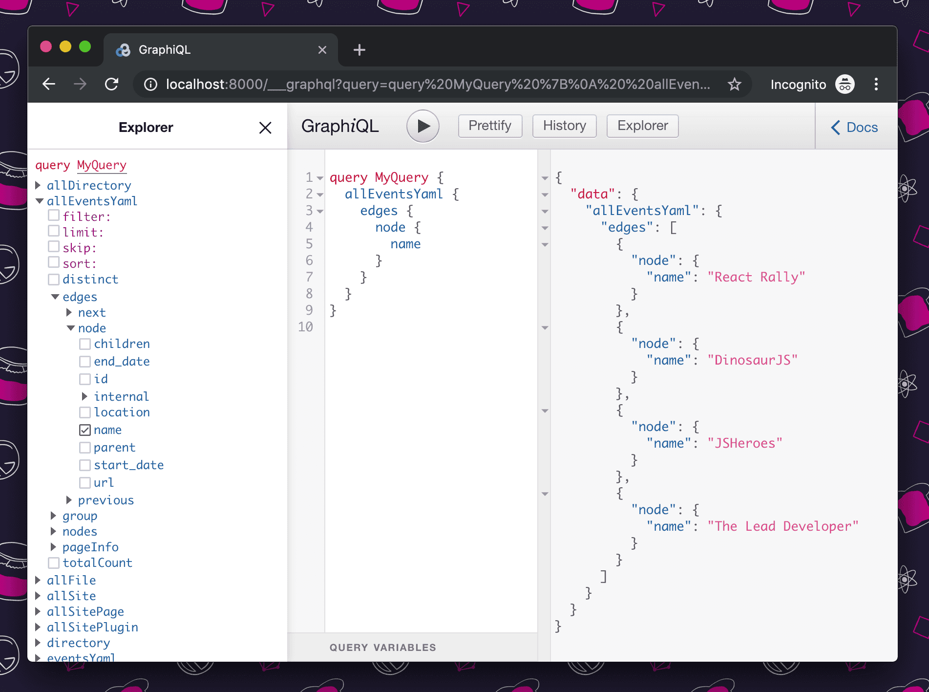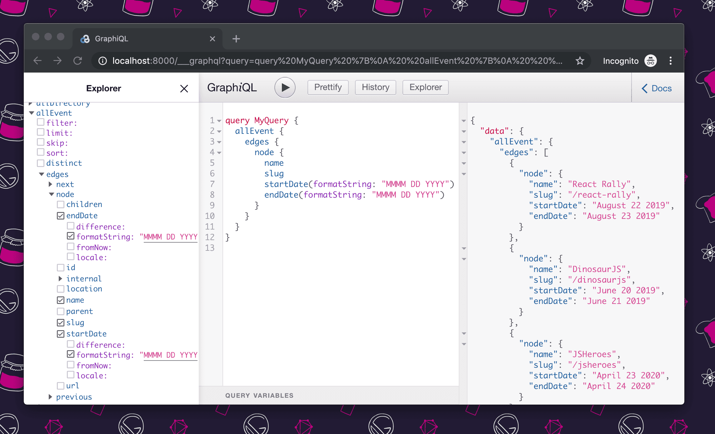Open up the GraphiQL explorer for the site, and make a test query on allEvent:
