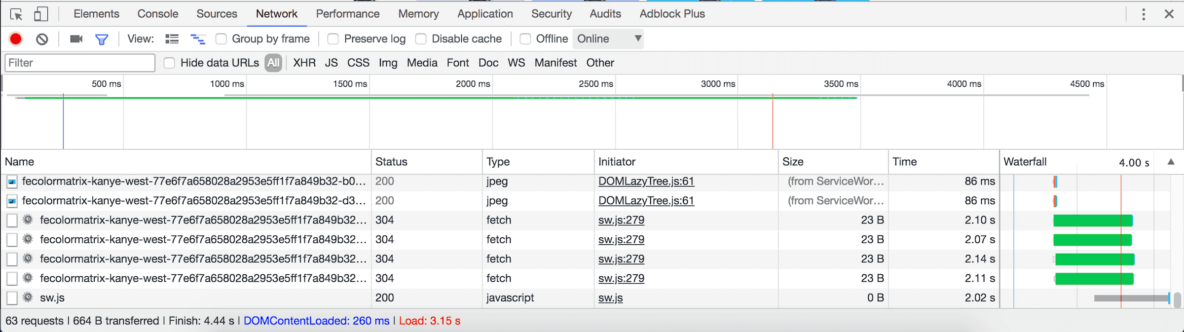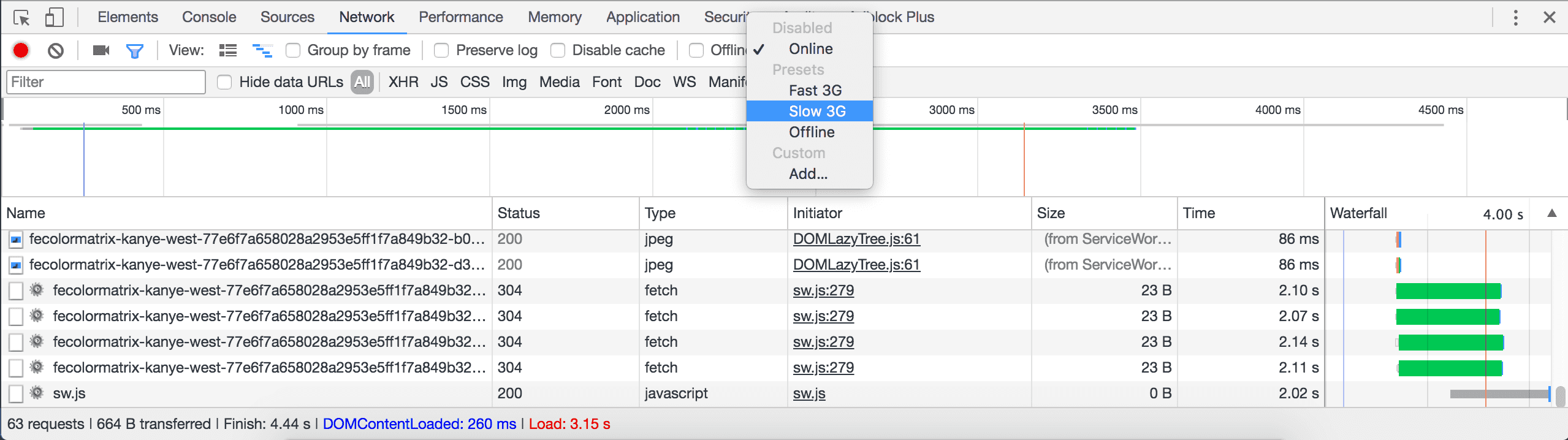 Open your browser console and change the network speed to something slower. In Chrome, you can click on the “network” tab, then on the drop down arrow next to the word “Online.” Then click “Slow 3G.” Now, reload your page and watch the blur-up effect in action. The network tab also shows statistics on when each image loaded and how much time it took them to load.